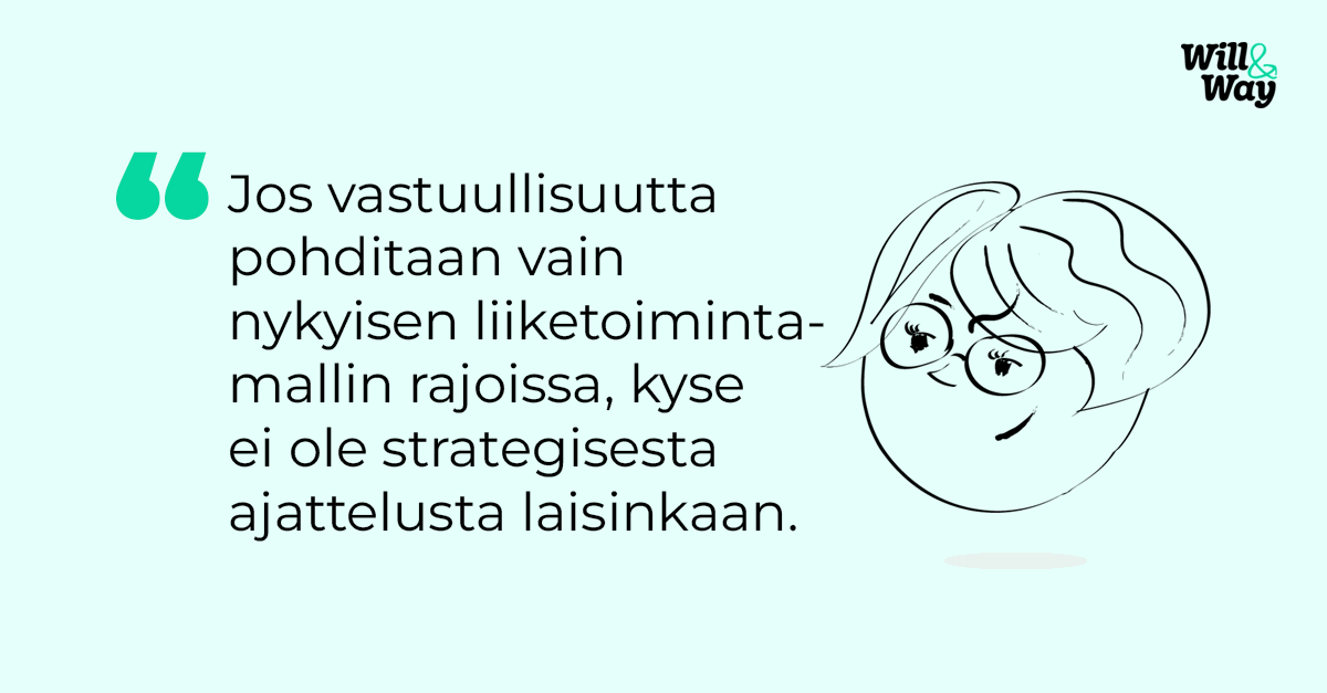 Isoja kysymyksiä, tiedän. Sellaisiahan strategiaprosessissa pitää pohtia, jos se tehdään kunnolla. Jos sen sijaan nykyistä liiketoimintamallia pidetään kiveen hakattuna, ja vastuullisuutta pohditaan vain sen sallimissa rajoissa, kyse ei ole strategisesta ajattelusta laisinkaan.
